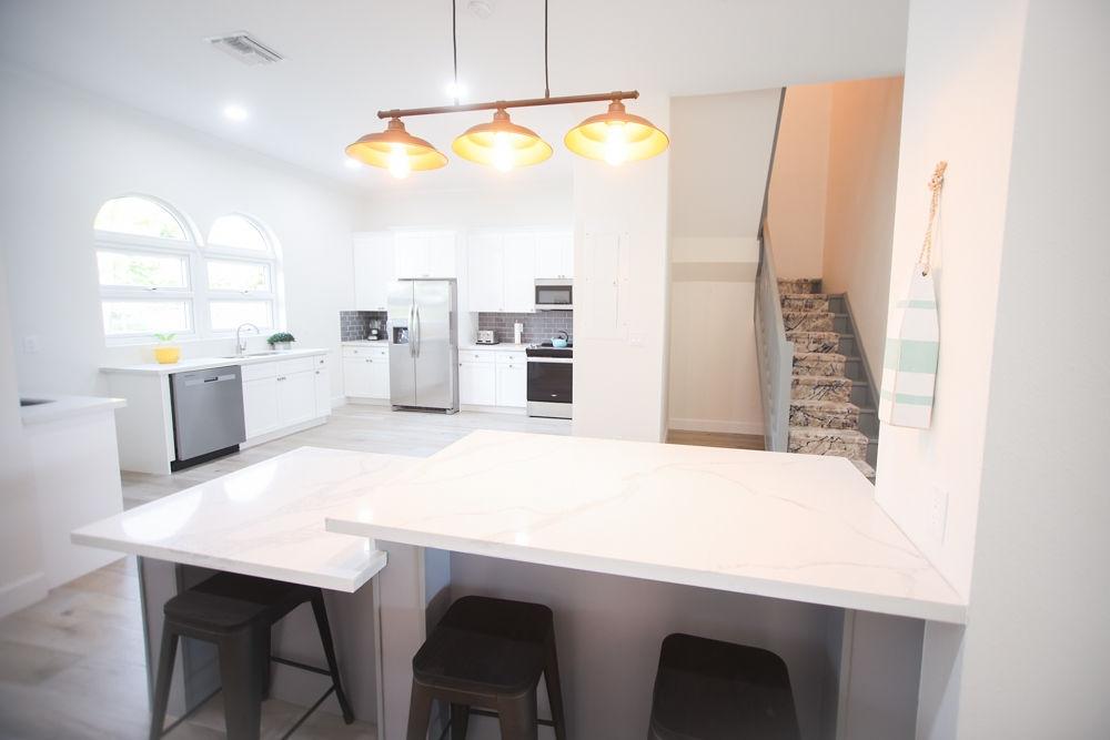 The Grand Bahama Villa is 5 bedroom 5.5 bath villa overlooking the marina at Villa Marina Cove. Centrally located on Midshipman Road it is conveniently located between Taino Beach and Port Lucaya. The ground floor of the villa is fully wheelchair accessible with a separate entrance, ramps, and a compliant bathroom and kitchen. The 5 bedrooms are elegantly furnished with king beds and premium linens with ensuite luxury bathrooms. The living room features an 85-inch TV and the bedrooms are equipped with 55-inch smart TVâs. 3 bedrooms are located on the ground level with the gourmet kitchen, large dining area and living area with patio doors leading to an outdoor patio and the marina. There is also a half bath and full-size washer and dryer located on the ground level. Upstairs features a large master suite equipped with ensuite bathroom with glass shower stall, double vanity, and soaker tub. The 2nd upstairs bedroom has a king size bed, desk and ensuite bath. Covered parking and an outdoor pool are included and the entire property is secured and gated.