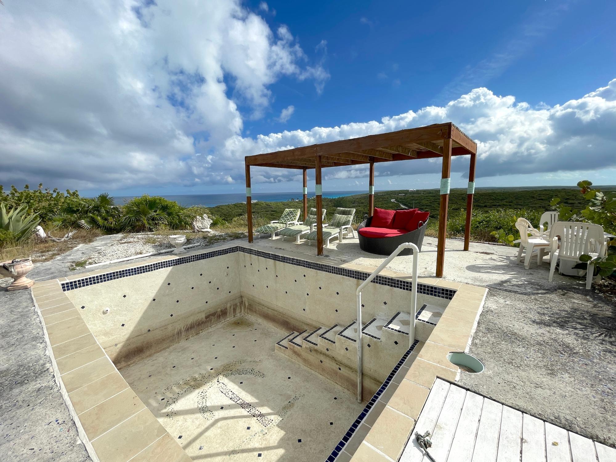 2 Bedroom/1 bath with 1 car garage and pool. 120 ft. above sea level with sprawling views of the Atlantic Ocean and Bahama Bank - sunset and sunrise. Located in the resort community of Stella Maris where residents enjoy the resort amenities, including restaurants and pool bar and grill. Enjoy a dip in the pool while watching the sunrise or just sip on a cup of coffee and take in the views. The home is being sold furnished. The 3rd room can be converted into a second bathroom. 30,000 gallon water supply. Concrete construction. Tiles throughou. 3 rainwater cisterns. Pool - 12x14x7 feet (depth) 2 patios without screens 1 covered patio. Pergola by the pool. A/C units in all rooms. Bathroom recently renovated and has direct views to the outdoor scenery. Large primary bedroom which opens on to the deck.