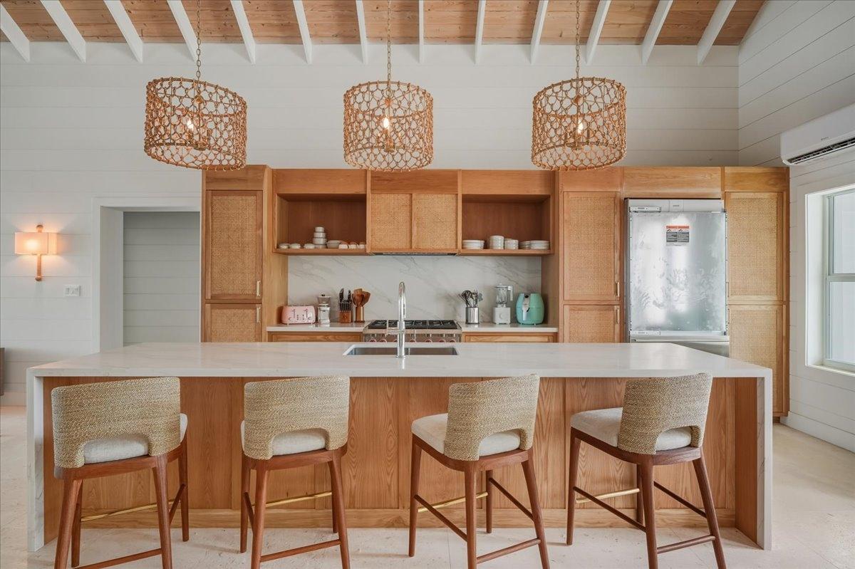 Experience Blu Wakes, an ultra-luxury five-bedroom, four-bathroom beachfront villa on the pristine shores of Hoopers Bay, Exuma â one of the most coveted stretches of beach in The Bahamas. This stunning, one-story architectural gem has been masterfully designed for modern coastal living, where refined elegance meets barefoot luxury. Step inside to discover an open-concept layout with vaulted ceilings, creating a grand sense of space and light. The modern, fully equipped kitchen with island bar and dining area flows effortlessly into the spacious living room. Two primary oceanfront suites each open to their own private terrace, offering uninterrupted sea views. The fourth and fifth bedrooms share a full bathroom, ideal for families or guests. One features a king bed and generous closet space, while the other is a bunk room with a queen and full bed, blending practicality and style for visiting friends or children. Outside, a refreshing pool sits just steps from the back terrace, kitchen, and living room â creating a seamless transition from luxury interiors to beachfront living.