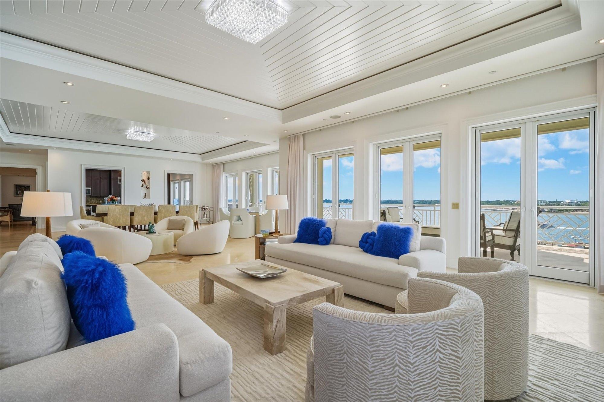 Enjoy exquisite bay, golf course, and ocean views from this luxurious 5 bedroom 4.5 bathroom, 7,224sf Penthouse located in Ocean Club Residences in the exclusive gated beachfront and golf course community of Ocean Club Estates on Paradise Island. This Penthouse has an open floorplan with living room, dining room, and TV room all leading out to an expansive covered terrace overlooking the pools, marina and harbour. The spacious master suite features hardwood floors, an office (or optional 5th bedroom), and his & her bathrooms. The master bedroom has serene harbour views while her master bathroom overlooks the golf course and ocean beyond. All of the bedrooms have ensuite bathrooms and balconies with golf course and sea views. The custom kitchen features include Dual Stainless Steel refrigerator/freezers, an illuminated center island, solid wood cabinetry, and granite countertops. Ocean Club Residences amenities include on-site concierge, a gym and fitness room, two pools, a private marina, a Beach Club with an infinity pool, tennis courts, and membership access to the Atlantis resort.