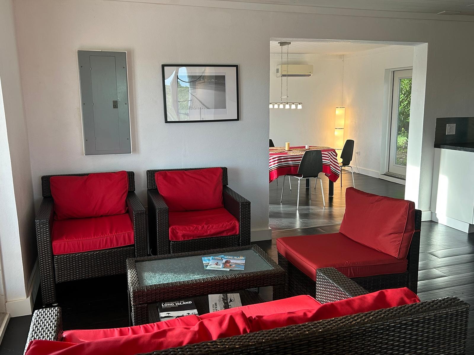 This open floorpan hilltop 2 storey home lies on a landscaped 3/4 acre and features stunning panoramic views over the north of Long Island including both sunrise and sunset (or moonrise & moonset) over water for the majority of the year. This property is turnkey and part of the Stella Maris Resort community minutes walking distance to the main resort restaurant, bars, and pools. Completely gutted in 2014, every element of the rebuild focused on reinforcing the existing cement block construction for maximum strength protection with simpson strong ties, stainless steel 5/8 threaded rods for deck supports, hurricane clips throughout the attic and 3 layers of waterproof paint underneath all flooring with floating vinyl plank flooring allowing for easy access as necessary. All baseboard trim is PVC. All electrical and plumbing systems were replaced. Drains were put in for both of the master bedroom bathtubs and the kitchen was specifically designed to sit off the ground in the event of water. All seating furniture is designed for indoor/outdoor reconfiguration.