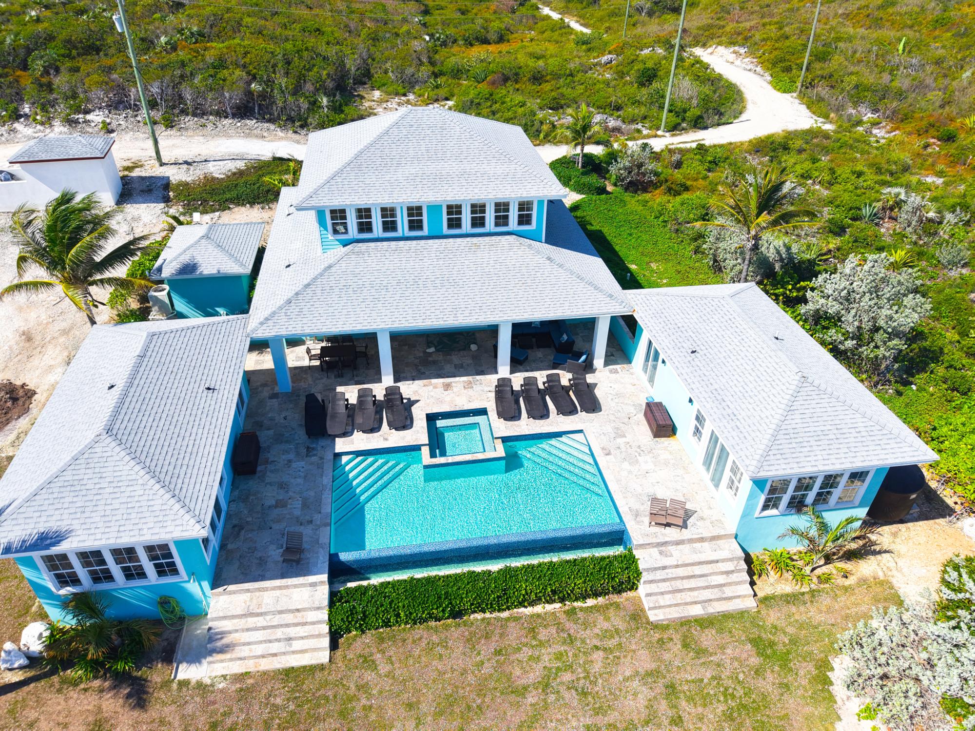 Positioned on a 20,000sqft lot with 98 feet of frontage on a powdery white sand beachfront, Treasure Cove Beach House is certainly a treasure in paradise. This 3500sqft 6 bedroom 5 bathroom luxurious home is nestled in the community of Farmerâs Hill in Great Exuma with privacy, all the amenities one could require and great snorkeling at its doorstep. The home is a short 10 minute drive from the Exuma International Airport which is currently undergoing extensive construction work to expand its ability to accommodate international arrivals. The home is designed with large families, elegance, comfort and enjoying the island in mind, and as you enter this becomes immediately evident. An open layout with high tongue-and-groove ceilings that holds a fully equipped kitchen with a large bi-fold window opening directly onto the pool deck, a 1,150sqft patio perched just above the Exuma Blues, a large heated infinity edged pool, hot tub, lounge seating and breathtaking views all make for the perfect island oasis. This home offers the perfect blend of indoor and outdoor entertainment, whether