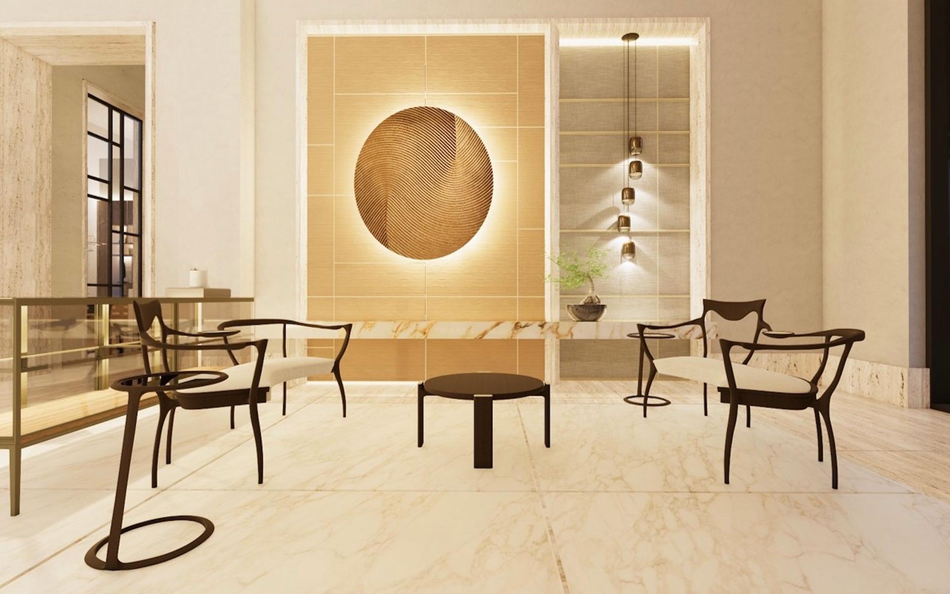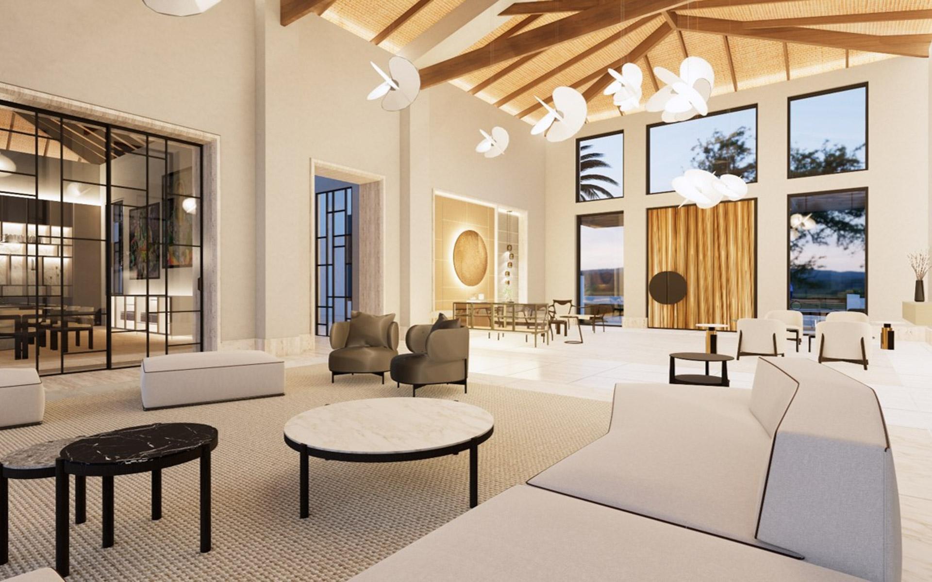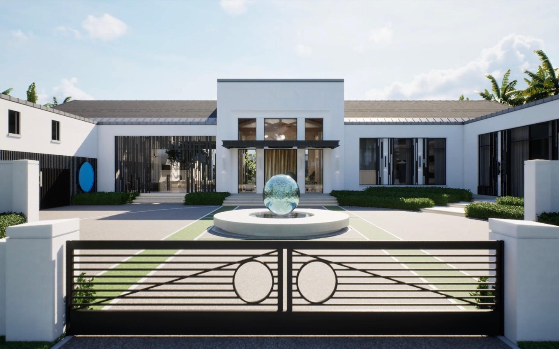 Situated at the entrance of the prestigious Equestrian Estates at Albany, ZOI is a masterful modern interpretation of a courtyard home. Spanning 1.2 acres, this estate offers approximately 12,000 square feet of air-conditioned living space, thoughtfully designed by renowned architect THA and interior designer CVC. The residence features a truly iconic design, blending striking interiors with lush landscaping to create a seamless indoor-outdoor experience. Stepping into the living area, you are welcomed by vaulted 16 ft high ceilings with rattan and wooden beams. Two intimate seating areas flank the entrance, while beyond, expansive living spaces feature floor-to-ceiling windows. Off the living room, the formal dining area showcases a grand 16-seat table and a full-wall panoramic window, offering an unforgettable dining experience. The state-of-the-art kitchen complete with two large islands, and an additional 10-seat dining area flows into the family room enhancing the home's functionality and elegance.